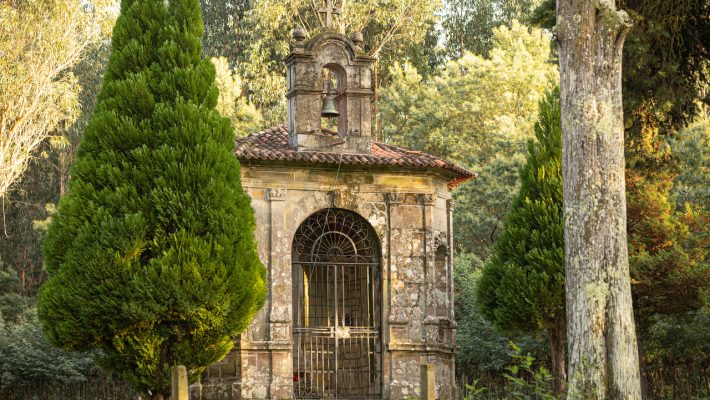 Esta pequeña y curiosa capilla, con forma de baldaquino, acoge en su interior un cruceiro y un peto de ánimas, fechados entre el siglo XVI-XVIII. Tres de los laterales están abiertos y protegidos por una cancilla de hierro que nos permite ver el interior. En la base del cruceiro se observa una inscripción dedicada a Santa María, mientras que, en el varal, de base hexagonal, vemos diversos elementos pintados, alegóricos de la pasión de Cristo. El capitel, que también conserva restos de policromía, está decorado con hojas superpuestas sobre las que se sitúan un Cristo crucificado, con una imagen la Virgen con el Niño en el otro lado.